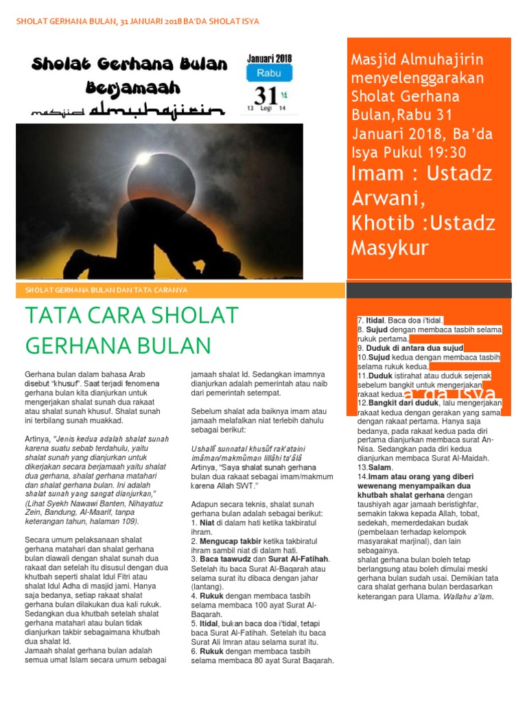 Bagaimana hukum shalat gerhana dan tatacaranya serta khutbahnya. January 31, 2018 hisyam syafiq leave a comment. Matahari dan bulan adalah dua tanda. Dan umat islam disunnahkan melakukan sholat gerhana bulan. Gerhana bulan tahun 1866 silam, insyaallah terjadi lagi 31 januari 2018.