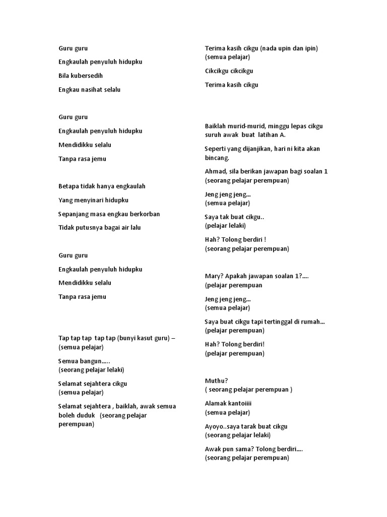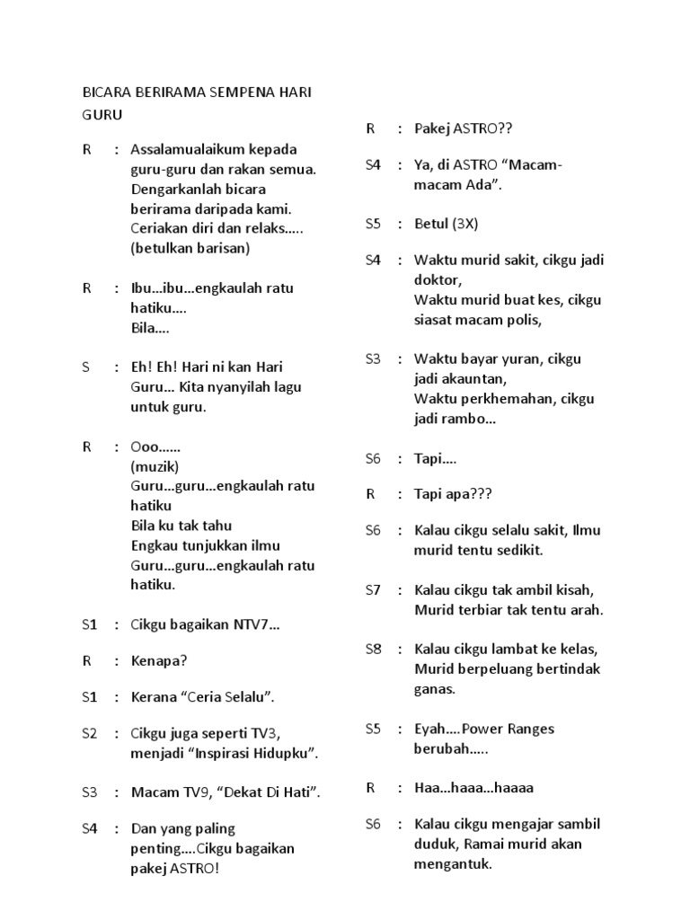 Use the download button below or simple online reader. Skrip assalamualaikum dan salam 1malaysia indah bicara halus berirama mencuit jiwa dari kami anak merdeka seiring bersama satu malaysia jadikan realiti. Anugerah konduktor terbaik 2018 naib johan skrip terbaik. Skrip bicara berirama sekolah menengah sungai bayor. 8 cara menghormati guru dalam kehidupan sehari hari _ guru adalah orang tua kedua bagi siswa ketika berada dilingkungan sekolah.