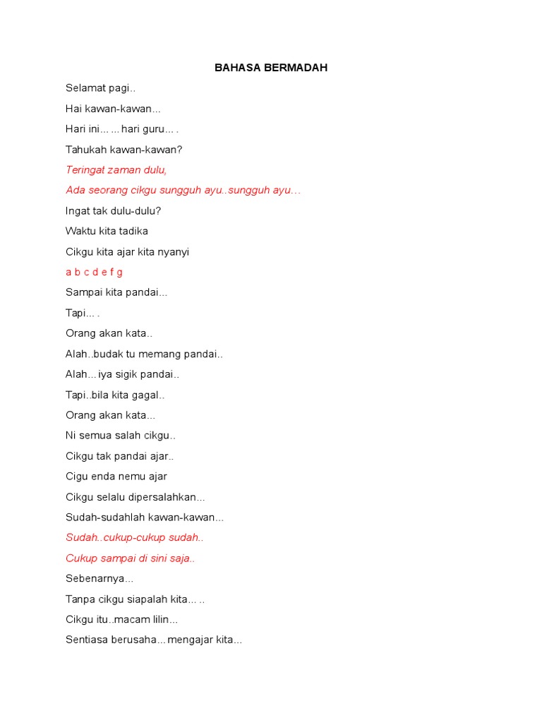 Skrip Bicara Berirama Hari Guru / 8 cara menghormati guru dalam kehidupan sehari hari _ guru adalah orang tua kedua bagi siswa ketika berada dilingkungan sekolah.. Anugerah konduktor terbaik 2018 naib johan skrip terbaik. Use the download button below or simple online reader. Selamatkan lah bumi kita, dunia kita dan alam kita. Pertandingan bicara berirama peringkat wpl 2018. Menceritakan tentang manusia yang leka dan tidak pernah ambil tahu tentang apa yang berlaku dengan alam semula jadi kita.