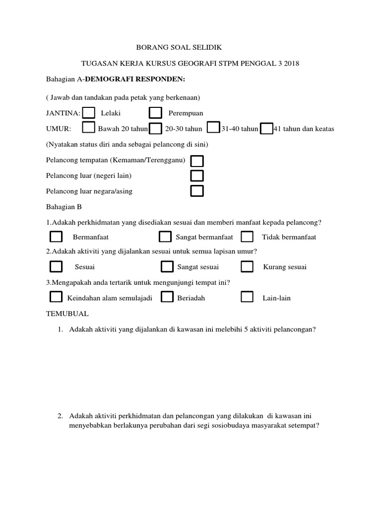 Garis Panduan Pelaksanaan Program Komunikasi Untuk Perubahan Tingkah Laku Combi Pdf Free Download from docplayer.net Tajuk kajian 'guna tanah di kawasan kajian anda' telah dipilih sebagai tugasan yang wajib disiapkan oleh setiap calon pt3 pada tahun 2018. Borang soal selidik pengakutan gaya hidup sihat politeknik contoh sejarah pt3 2019 guru (lampiran d) kaji survey. Sebagai contoh, satu soalan pada borang soal selidik mungkin boleh digunakan bagi mendapat jumlah ataupun agregat tidak rasmi dalam pemilihan pengerusi, presiden ataupun wakil kepada seusatu organisasi. Please fill this form, we will try to respond as soon as possible. Contoh borang soal selidik geografi migrasi dalaman via sportschuheherren2.blogspot.com. Dokumen ini merupakan satu sampel soalan bagi melaksanakan kajian dengan menggunakan kaedah soal selidik. Contoh borang soal selidik sejarah pt3 2019. Contoh soalan geografi pt3 2015.contoh borang soal selidik via cotographix.com.