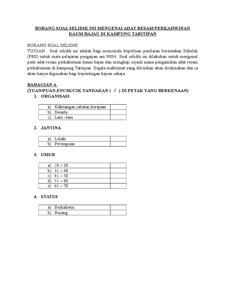 Hubungan etnik (zzzt 2173) semester ii sesi 2014/2015 makluman kepada responden : We are a sharing community. Semoga dengan perkongsian contoh borang soal selidik sejarah pt3 2019 ini sedikit sebanyak dapat membantu para pelajar untuk melakukan soal selidik dan menemu ramah individu penting untuk dimasukkan di dalam kajian kerja kursus sejarah pt3 2019 anda kelak. Perusahaan pengalengan sedang membutuhkan 4 karyawan baru untuk mengisi posisi berbeda yang kosong. Jika anda mencari contoh borang soal selidik dakwah maka anda berada di tempat yang tepat.