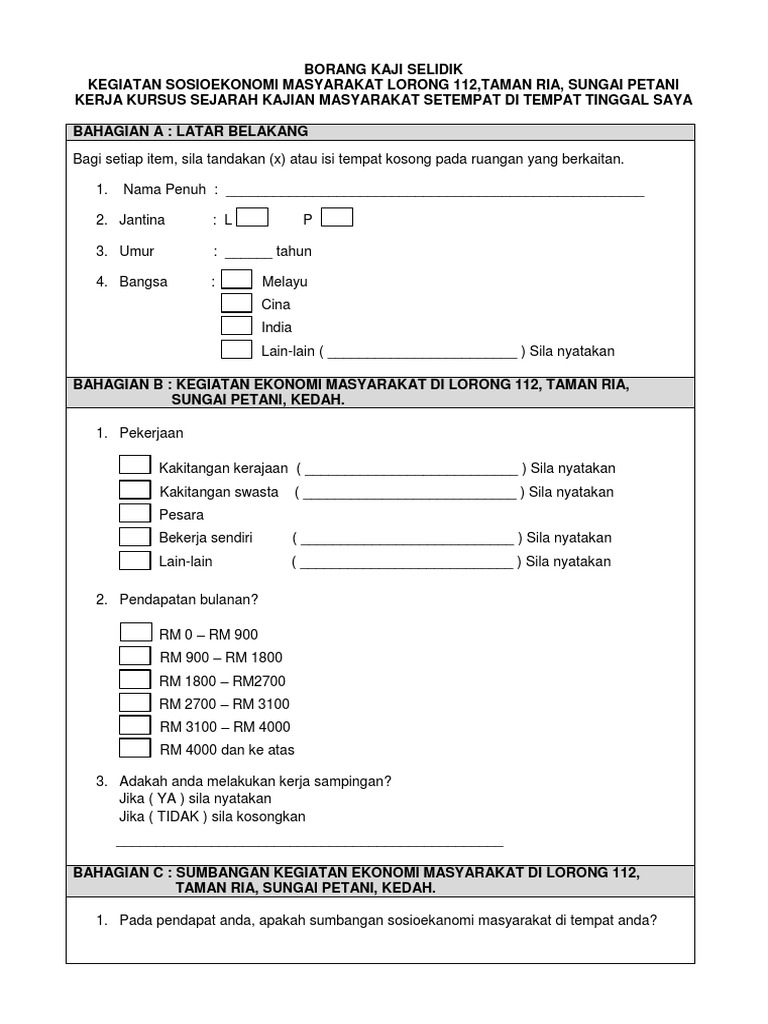 Related : Contoh Borang Soal Selidik Masyarakat Setempat - Contoh Borang Soal Selidik - Tajuk kajian 'guna tanah di kawasan kajian anda' telah dipilih sebagai tugasan yang wajib disiapkan oleh setiap calon pt3 pada tahun 2018..